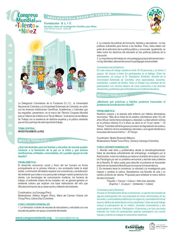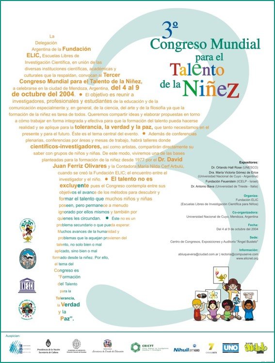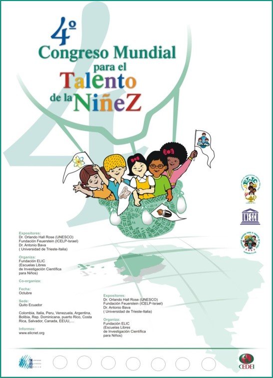 La Delegación Colombiana de la Fundación ELIC, Escuelas Libres de Investigación Científica para Niños, en unión con las diversas Instituciones Científicas, Académicas y Culturales que la respaldan, convoca al “10° Congreso Mundial para el Talento de la Niñez en el Tercer Milenio”.