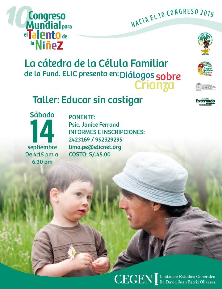 La Cátedra de la Célula Familiar de la Delegación de Lima, en el marco de su programa “Diálogos de Crianza”, presenta este sábado 14 de Setiembre, el Taller “Educar sin castigar“ a cargo de la Psic. Janice Ferrand, Directora ELIC, como actividad pre evento al 10CMTN. Se realizará a las 5.00 p.m.,en el auditorio de la Casa de la Cultura “Dr. David Juan Ferriz Olivares”, sito en Calle Narciso de la Colina 125. Miraflores.